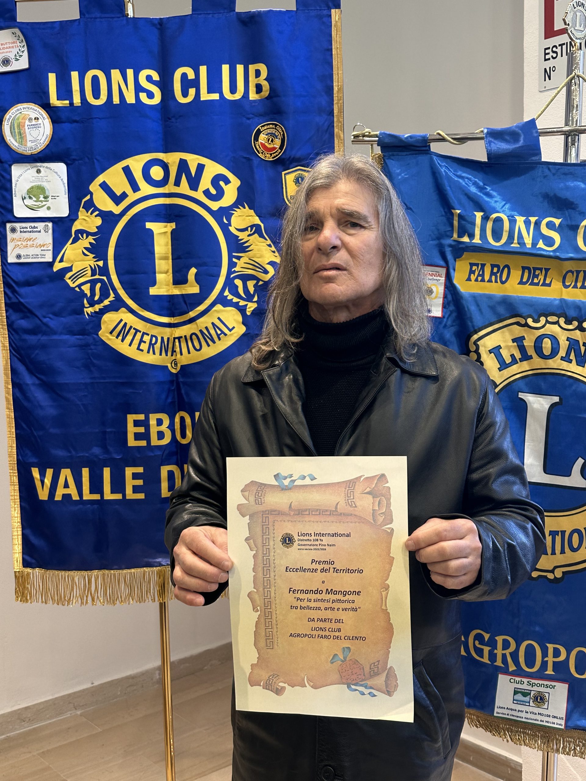 Questa mattina, nell’Aula consiliare del Comune di Eboli, il pittore Fernando Mangone è stato insignito del Premio Internazionale “Eccellenze del Territorio”, promosso dal Lions International – Distretto 108YA nell’ambito del service dedicato alla valorizzazione delle migliori espressioni professionali, artistiche e imprenditoriali del territorio. L’iniziativa si pone l’obiettivo di riconoscere e sostenere personalità che, attraverso il proprio talento, la propria competenza e il proprio impegno quotidiano, contribuiscono in maniera concreta alla crescita sociale, culturale ed economica delle comunità locali di Capaccio, Eboli, Agropoli, Castellabate e Battipaglia. Il riconoscimento conferito a Fernando Mangone rappresenta un tributo alla sua ricerca artistica, capace di attraversare linguaggi e visioni, restituendo all’arte una dimensione autentica e profonda. La sua pittura si distingue per una sintesi originale tra attualità e dimensione interiore, andando oltre la semplice narrazione o denuncia per trasformarsi in esperienza estetica e riflessione. In un tempo in cui l’arte rischia spesso di essere confinata nella cronaca o nella provocazione, il lavoro di Mangone riafferma con forza il valore dell’espressione artistica come atto di consapevolezza, capace di generare una vera e propria catarsi e di interpretare il presente senza perdere il legame con la storia e l’identità culturale dei luoghi.