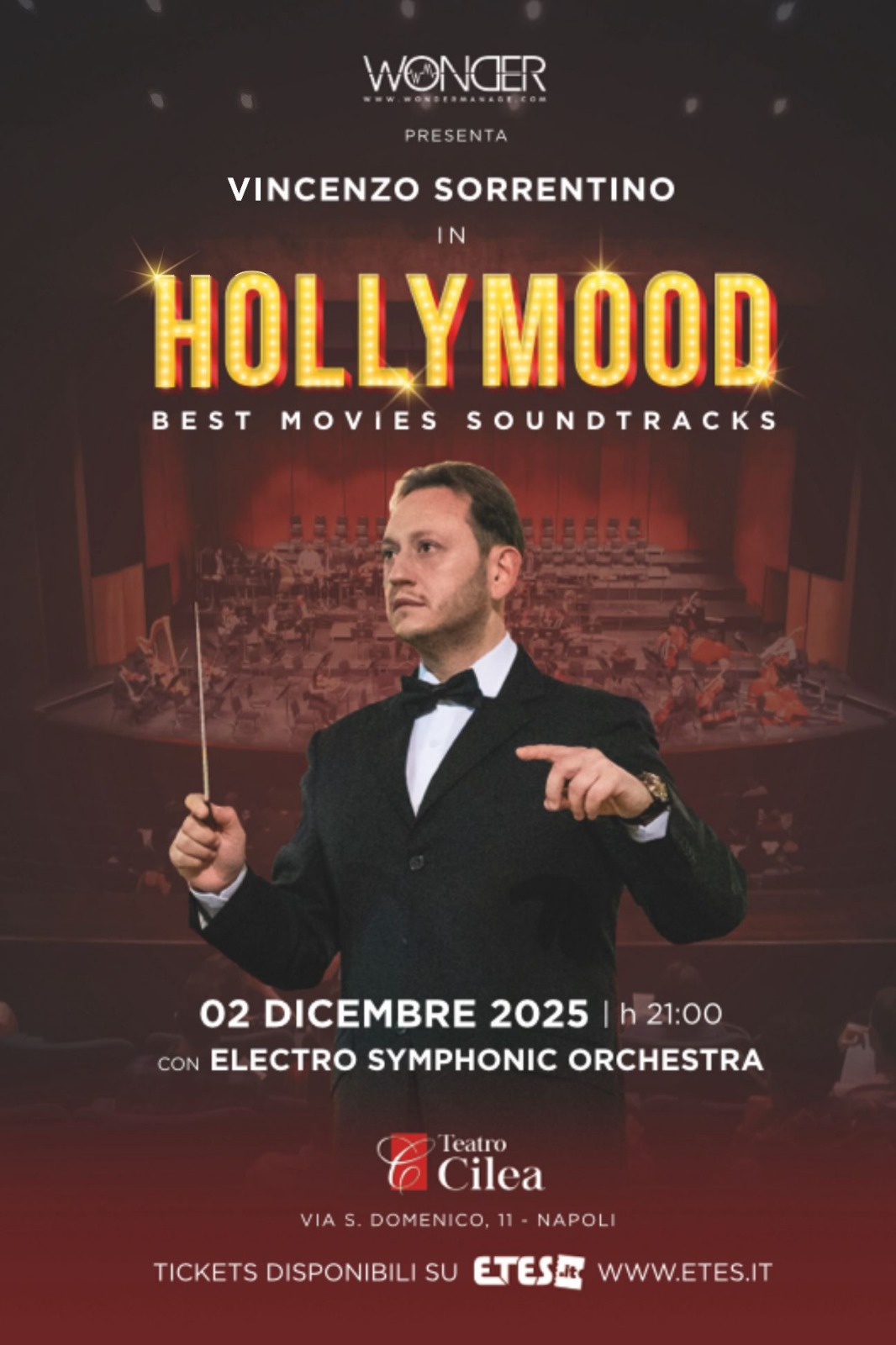 La magia di Hollywood si accende sul palco del Teatro Cilea di Napoli. Il 2 dicembre andrà in scena “Hollymood”, spettacolo in anteprima nazionale dedicato alle più iconiche colonne sonore del cinema americano, rivisitate in chiave sinfonica ed elettronica dal maestro Vincenzo Sorrentino, accompagnato dalla sua Electro Symphonic Orchestra.