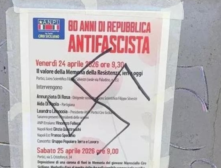 A Portici, ignoti hanno disegnato una svastica sulla porta d’ingresso della sede dell’Anpi, tracciandola su un volantino che annunciava le iniziative per la Festa della Liberazione. Gli eventi in programma celebravano gli 80 anni della Repubblica antifascista, con appuntamenti tra cui un incontro al liceo scientifico Filippo Silvestri e la deposizione di una corona d’alloro in memoria del maresciallo Ciro Siciliano, medaglia d’oro al merito civile.