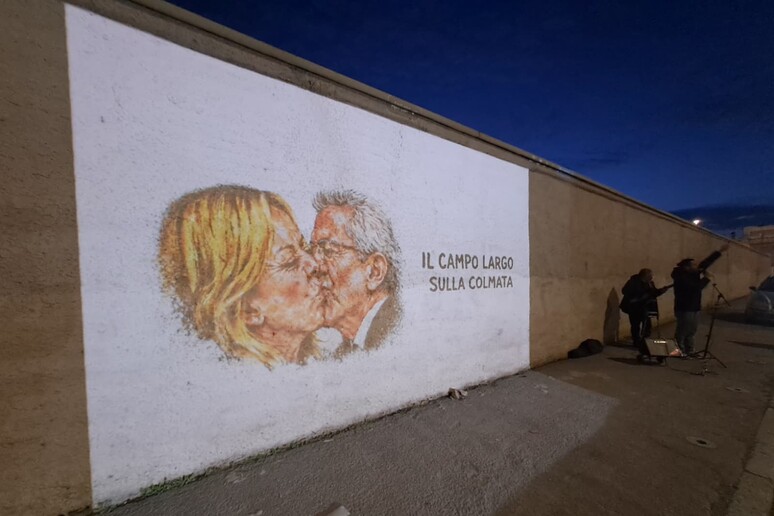 Una performance artistica per contestare l’organizzazione dell’America’s Cup nel golfo di Napoli. È quanto avvenuto in serata a Bagnoli, dove sul muro dell’ex Italsider in via Coroglio il muralista australiano Ineos ha proiettato alcune opere a sostegno della rete di attivisti “No America’s Cup”. Tra le immagini proiettate spicca quella che raffigura un bacio tra la presidente del Consiglio Giorgia Meloni e il sindaco di Napoli Gaetano Manfredi, ispirata alla celebre opera che ritrae il bacio tra Leonid Breznev ed Erich Honecker, simbolo della propaganda sovietica. L’iniziativa, spiegano gli organizzatori, nasce come gesto artistico e politico per sostenere le proteste di alcuni gruppi contrari all’evento velico internazionale previsto a Napoli nel 2027.