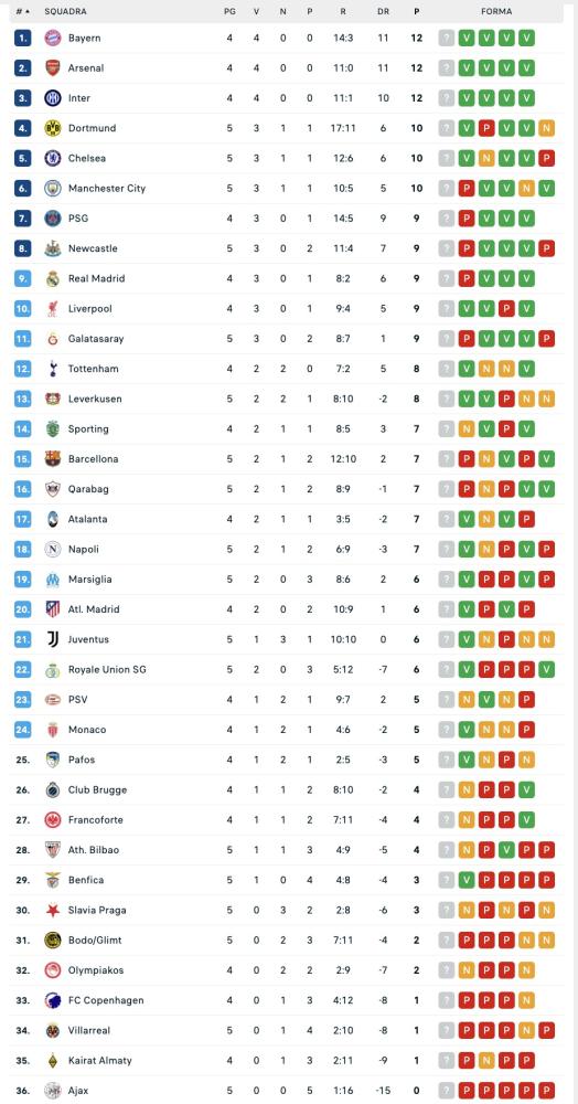 Di seguito la classifica della league phase di Champions League dopo le gare del martedì: