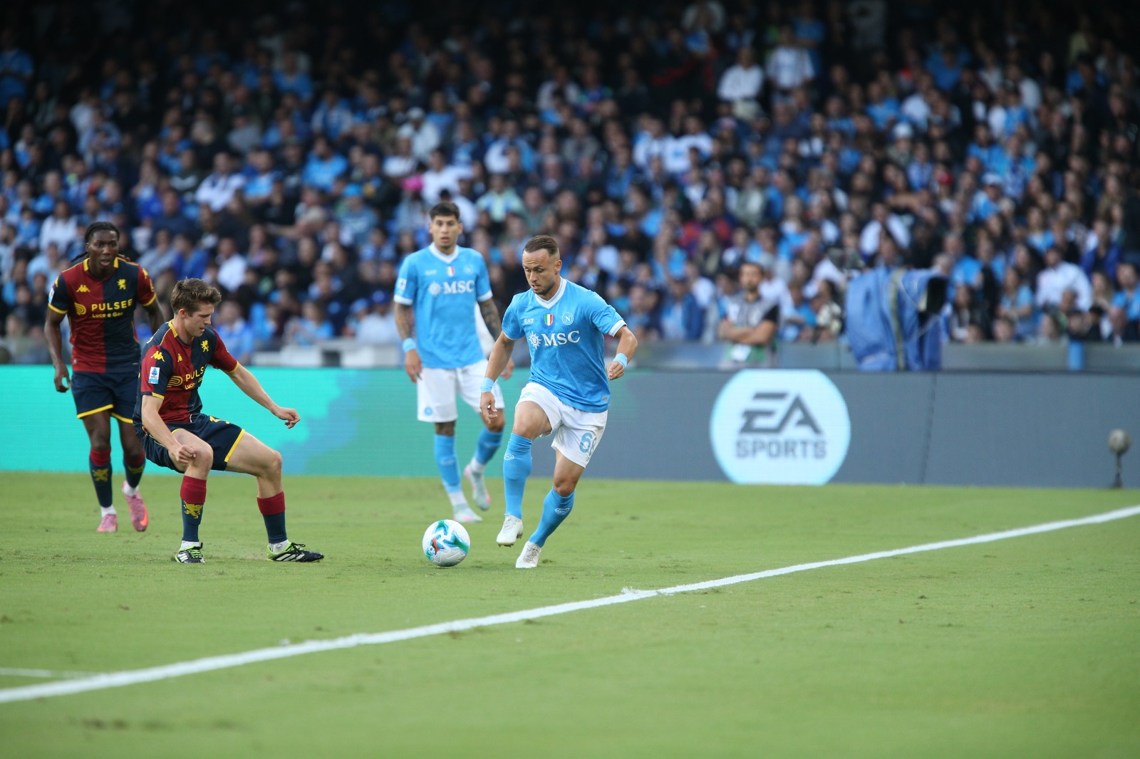 Per certi versi, Lobotka e Gilmour sono sovrapponibili, almeno morfologicamente: a stento arrivano al metro e 70. Eppure dominano la zona nevralgica dei Campioni d’Italia in virtù di una innegabile abilità nell’allargare o restringere il campo. Inoltre, lo slovacco svolge un preziosissimo lavoro difensivo – per contrasti e recuperi -, avendo forza nelle gambe spendibile nel resistere alla pressione individuale. Dal canto suo, lo scozzese consente ai partenopei di sfruttare la dimensione del lancio lungo. Col Genoa, per esempio, Vieira ha provato a metterlo in ombra, impedendogli la costruzione da dietro. Allora, per misurare l’impatto tattico dell’ex Brighton non va trascurato il ribaltamento del fronte, con cui, invece di forzare il passaggio sul breve, esplorava la profondità.
