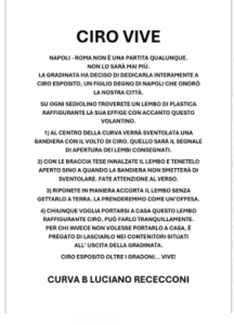 Tutta la redazione di Tv Luna si associa al manifesto in omaggio al povero Ciro Esposito ferito mortalmente da un delinquente psicopatico travestito da tifoso il 3 /5/2024 prima di Napoli Fiorentina e abbraccia simbolicamente mamma Antonella Leardi e il suo papà serando che atti delinquenziali non si verificano più !