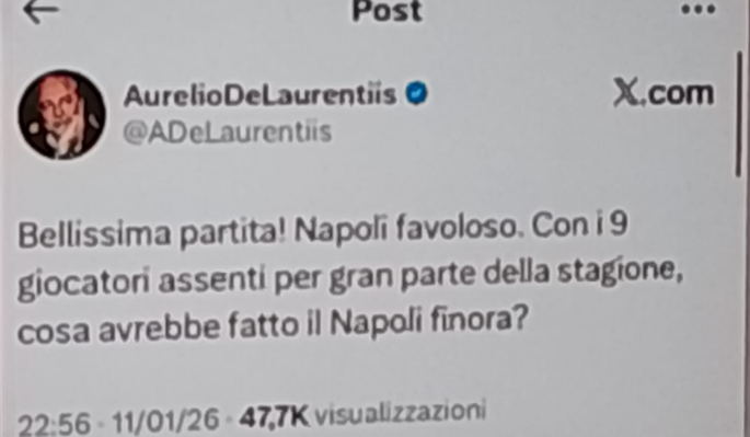 Il Napoli fa 2-2 a San Siro contro l’Inter. Il presidente azzurro Aurelio De Laurentiis twitta orgoglioso sul proprio account X, mettendo in evidenza l’impresa della squadra di Conte che con tantissime assenze da inizio anno è ancora in piena lotta scudetto: “Bellissima partita! Napoli favoloso. Con i 9 giocatori assenti per gran parte della stagione, cosa avrebbe fatto il Napoli finora?“.