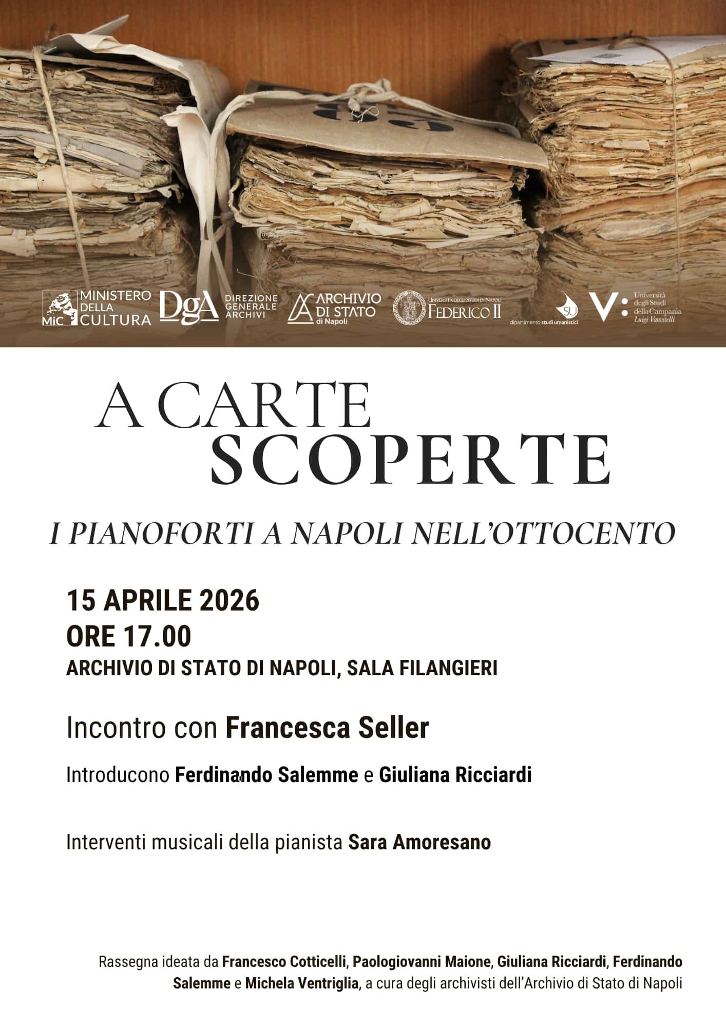 La rassegna _A carte scoperte_ è realizzata con il contributo del Ministero della Cultura – Direzione generale Archivi, dell’ Università degli studî di Napoli Federico II – Dipartimento di Studî umanistici e dell’ Università degli studî della Campania Luigi Vanvitelli.