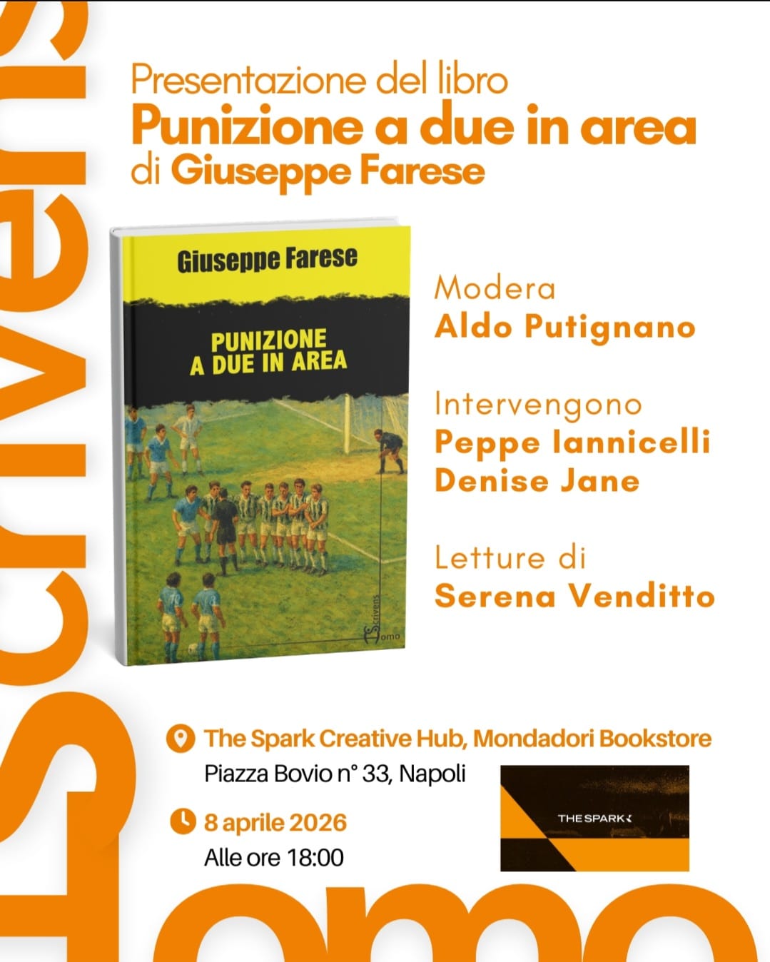 Punizione a due in area di Giuseppe Farese, Homo Scrivens Edizioni (Collana “Gatti neri e vicoli bui”), romanzo che Maurizio de Giovanni definisce “poliziesco efficace e sorprendente”, si presenta mercoledì 8 aprile 2026 alle ore 18:00 alla libreria The Spark in Piazza Bovio a Napoli.