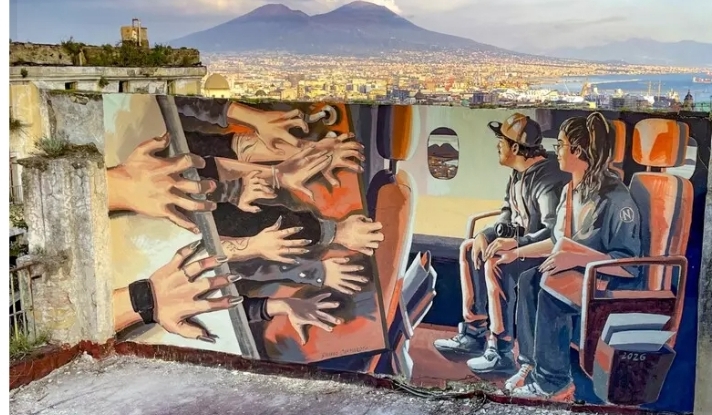 L’opera colpisce per la sua forza simbolica: raffigura due giovani seduti su un aereo in fase di atterraggio su Napoli, mentre ai lati emergono numerose mani pronte ad aprire una porta. Quelle mani rappresentano gli interessi degli speculatori immobiliari, contrapposti ad altre mani che cercano invece di tenere chiusa quella porta, in una lotta visiva tra chi difende il diritto alla casa e chi punta al profitto.