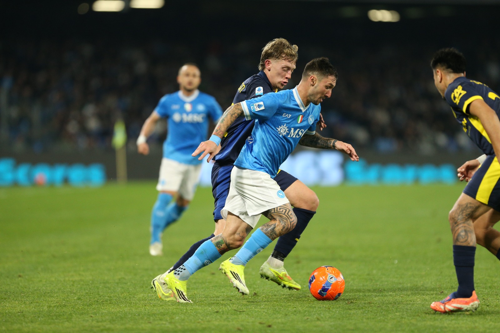 Con il brasiliano a mezzo servizio, a garantire maggiore imprevedibilità ha provveduto la catena di destra. Là, contro il Parma, la strategia era favorire le continue rotazioni tra Politano e Mazzocchi. Che scaglionandosi ad altezze diverse (uno più largo, l’altro più basso), sovraccaricavano quel lato, alternandosi nel dialogare tra loro. Aperto alla massima ampiezza, Matteo cercava subito di isolarsi individualmente contro Ordonez. In ciò, supportato dalla reattività del nativo di Barra, lesto ad allungarsi per portargli via l’eventuale uscita in closeout di Valenti.