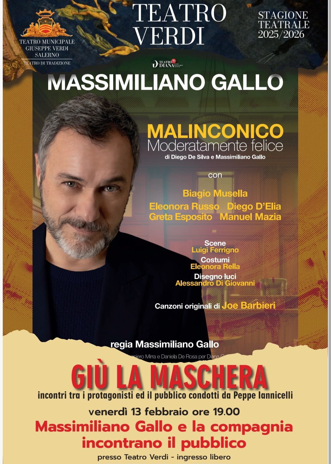 L’incontro Giù la maschera con Massimiliano Gallo e la sua compagnia, condotto da Peppe Iannicelli (ingresso libero e gratuito), è in programma venerdì 13 Febbraio alle ore 19.00 presso il Teatro Verdi in via Roma a Salerno.
