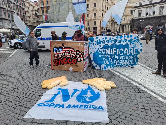 Davanti ai mezzi delle forze dell’ordine, che hanno chiuso completamente l’accesso alla piazza, i manifestanti hanno esposto una grande scatola di cartone con la scritta “America pacco” e uno striscione con la frase “Una sola grande opera, bonificare il mare e la spiaggia di Bagnoli”. Un altro striscione, sorretto da due grandi mani di plastica simbolo dei lavoratori di Bagnoli, riportava la scritta “No Coppa America”.