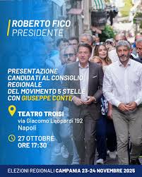 Oggi lunedì 27 ottobre, alle ore 17.30, il Teatro Troisi di Napoli ospiterà la presentazione ufficiale dei candidati del Movimento 5 Stelle al Consiglio regionale della Campania. All’evento saranno presenti il presidente del Movimento, Giuseppe Conte, e il candidato alla presidenza della Regione, Roberto Fico. “La squadra che presentiamo – spiega il coordinatore regionale del M5S, Salvatore Micillo – è composta da donne e uomini di grande competenza, profondamente radicati nei loro territori e pronti a rappresentare con determinazione la voce del Movimento in ogni provincia della Campania”.