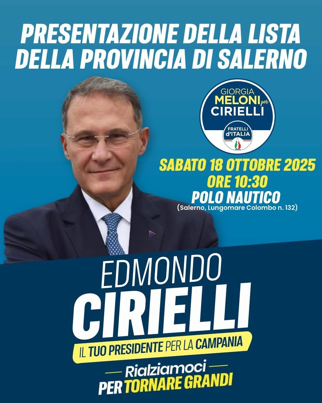 All’incontro sarà presente il candidato del centrodestra alla presidenza della Regione Campania, Edmondo Cirielli, attuale viceministro degli Esteri, che illustrerà le linee guida del programma elettorale e le priorità del suo progetto politico per il territorio.