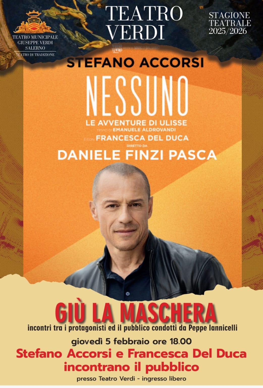 Giovedì 5 febbraio alle ore 18 Stefano Accorsi sarà protagonista di “Giù la maschera” nel foyer del Teatro Municipale Giuseppe Verdi di Salerno. L’incontro, aperto al pubblico e a ingresso gratuito, sarà condotto dal giornalista Peppe Iannicelli e offrirà l’occasione per approfondire con l’attore temi, ispirazioni e retroscena dello spettacolo “Nessuno – Le avventure di Ulisse”, in scena al Verdi fino a domenica 8 febbraio in esclusiva per la Campania.
