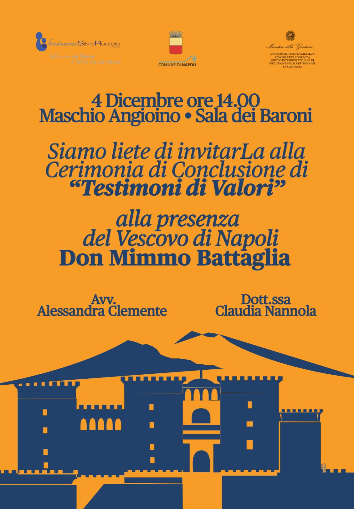 Il 4 dicembre alle 14, alla Sala dei Baroni del Maschio Angioino, ci sarà la serata conclusiva di Testimoni di Valore, alla presenza del Vescovo di Napoli don Mimmo Battaglia.